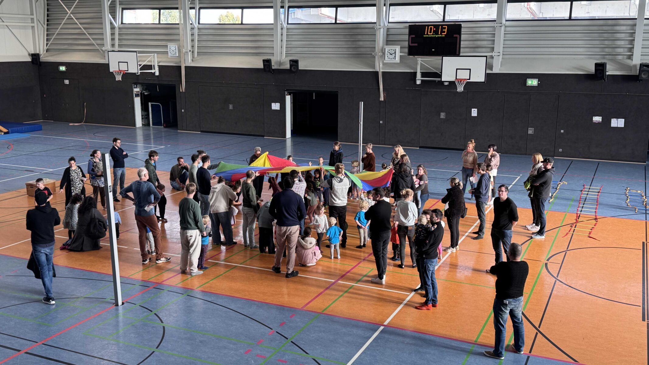 Ca. 60 Mädchen und Jungen im Alter von 3-6 Jahre sind mit ihren Eltern in die Almhalle geströmt und konnten sich dort bei gemeinsamen Aktivitäten, wie z. B. einem Schwungtuch und an 10 kleinen Stationen austoben.