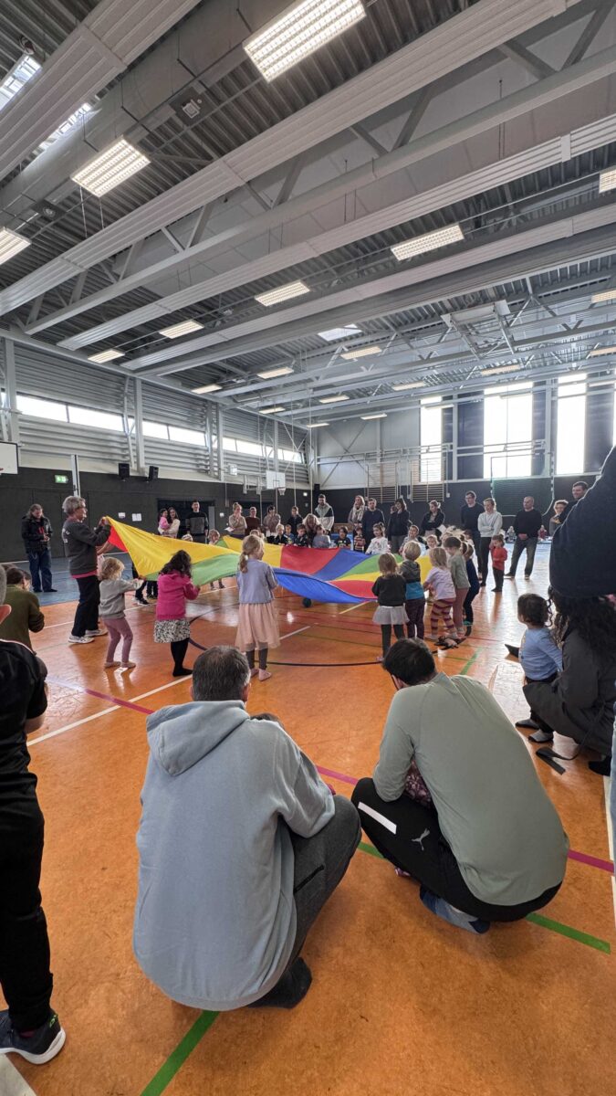 Ca. 60 Mädchen und Jungen im Alter von 3-6 Jahre sind mit ihren Eltern in die Almhalle geströmt und konnten sich dort bei gemeinsamen Aktivitäten, wie z. B. einem Schwungtuch und an 10 kleinen Stationen austoben.